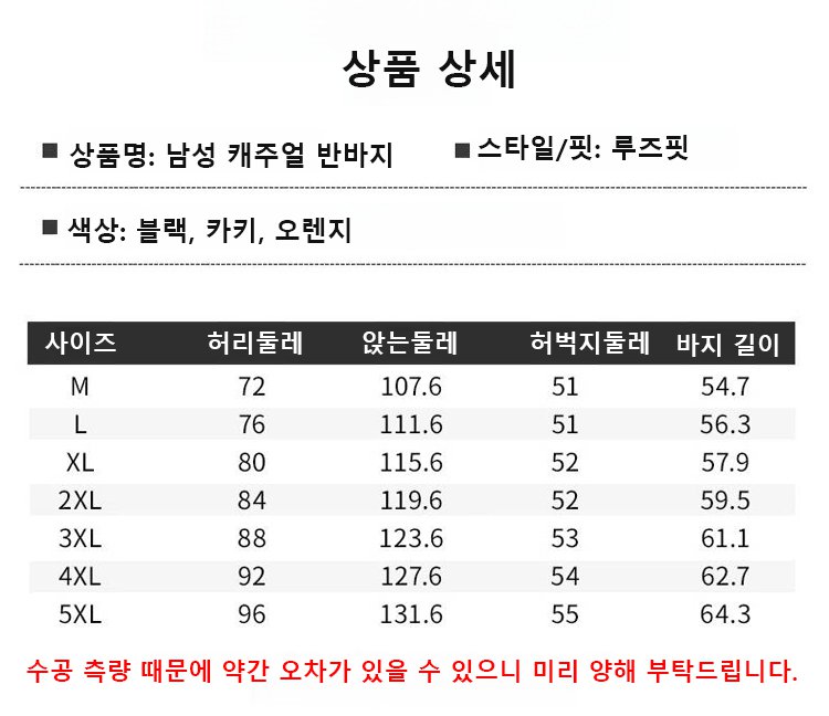 남성 캐주얼 반바지 사이즈 안내